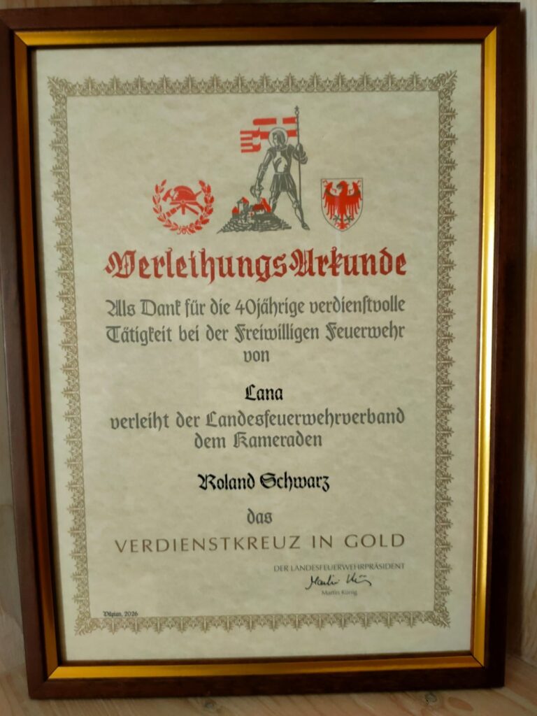 Insbesondere die Ehrungen für 40 Jahre gilt es zu erwähnen, da in diesem Zuge unser Kommandant Roland Schwarz für unglaubliche 40 Jahre bei der Feuerwehr Lana geehrt wurde. Das goldene Kreuz, das ihm verliehen wurde, stellt im Feuerwehrwesens Südtirols eine Auszeichnung für eine jahrzehnte Treue dar. In einer beachtlichen Karriere vom Wehrmann, über den Gruppenkommandanten, Zugkommandanten, Kommandant Stellvertreter und dann letztlich Kommandant, zeigte Roland in den letzten Jahrzehnten durch sehr viel Geschick, Fleiß, Diplomatie, immer mit einer klaren Linie, viel Interesse und häufig aber auch viel Geduld, aber immer mit einem höchstem Maß an Leidenschaft seine Liebe zur Feuerwehr Lana. Die Feuerwehr Lana und insbesondere der Vorstand gratuliert Roland zu dieser herausragenden und wohlverdienten Auszeichnung und bedankt sich für den unermüdlichen und selbstlosen Einsatz der letzten 40 Jahre.