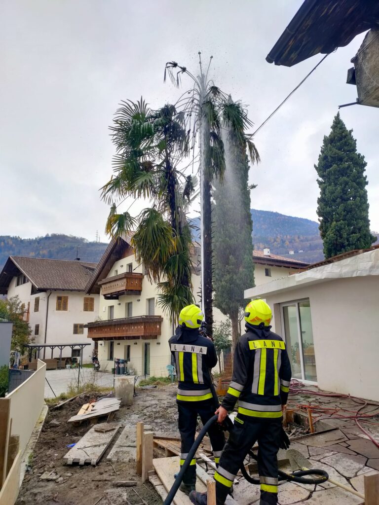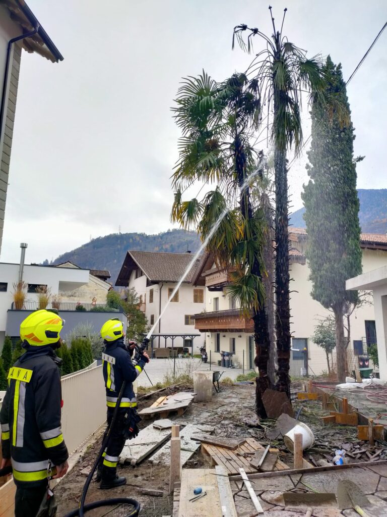 Zu einem ungewöhnlichen Einsatz wurde die Feuerwehr Lana am Montag 24. November 2025 gerufen: auf einer Baustelle in Mitterlana hatte eine Palme Feuer gefangen. Die Einsatzkräfte rückten an und löschten den Brand mittels Schnellangriffschlauch, sodass innerhalb kürzester Zeit die Meldung „Brand aus“ gegeben werden konnte. Nach einer ausgiebigen Kontrolle konnte der Einsatz beendet werden.