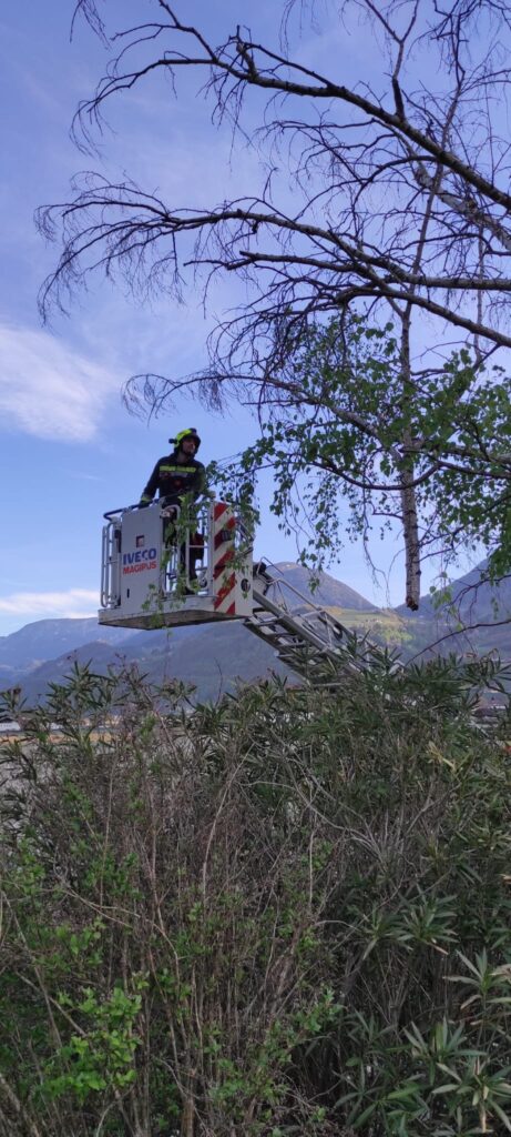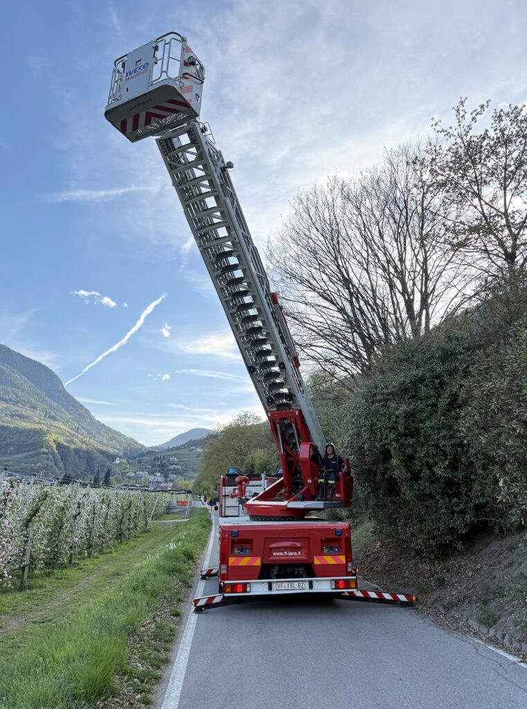 Am Ostersonntag den 5. April 2026 alarmierte ein Spaziergänger die Feuerwehr Lana, da eine Birke am Falschauerdamm drohte mehrere Äste zu verlieren und auf die darunterliegende Straße zu fallen. Nach einem Lokalaaugenschein entschied man sich, die Gefahr zu beseitigen, da die Äste zum Teil auch großen Umfanges waren und der viel frequentierte Eichweg darunter unmittelbar betroffen war. Mithilfe der Drehleiter konnten die betroffenen Äste innerhalb kürzester Zeit entfernt werden. Eine weitere Birke wenige Meter weiter wurde ebenso von potentiell herabfallenden Ästen befreit.
