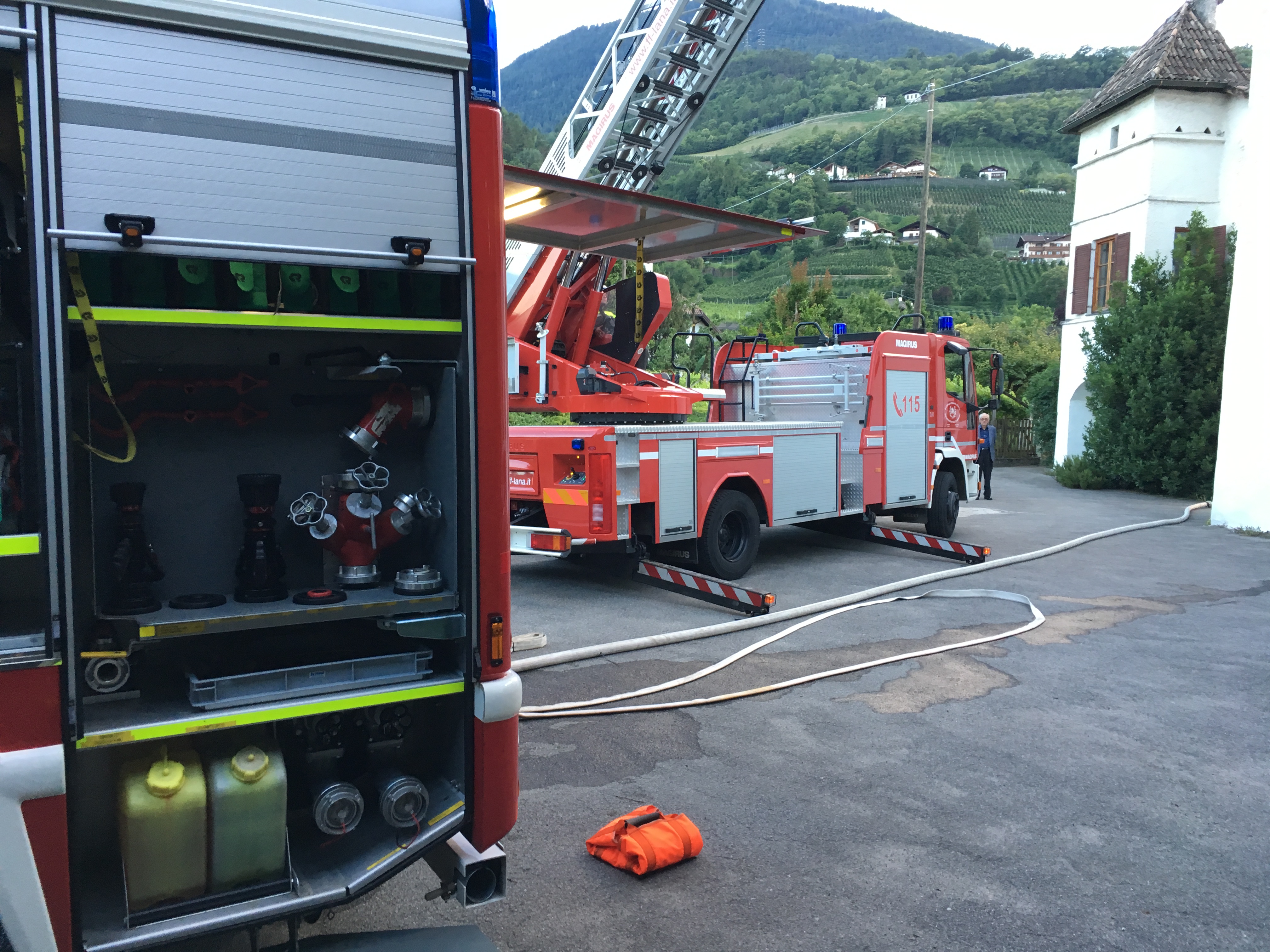 Kürzlich hielten die 2. und die 5. Gruppe vom 2. Zug eine gemeinsame Übung ab. Objekt war das Schloss Goldegg in Mitterlana, in dem ein Kellerbrand sowie Dachstuhlbrand simuliert wurde. Die FF Lana rückte mit dem Kleinlöschfahrzeug, dem großen Tanklöschfahrzeug, sowie der Drehleiter aus.
